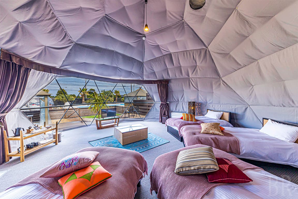 各ドーム内には快適に快適にお過ごし頂けるよう、エアコンと空気清浄機、またバリから取り寄せたこだわりのインテリアを設置しております。